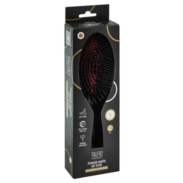 The Tauro Pro Line Prestige Collection Beechwood Brush with nylon pins and boar bristles is a premium grooming tool designed by professionals to simplify pet brushing. Its ergonomic, lightweight design prevents hand fatigue during brushing sessions. This brush is ideal for adding volume to long, dense coats, effortlessly brushing out tangles, and enhancing shine with boar bristles. The special pins provide gentle care while preventing hair breakage. Thanks to its anti-static properties that help prevent static buildup, resulting in smoother and shinier coats. It also ensures the smooth distribution of your pet's natural coat oils. Discover the Tauro Pro Line brushes, crafted by professionals using top-quality materials to ensure optimal results and an enjoyable brushing experience.