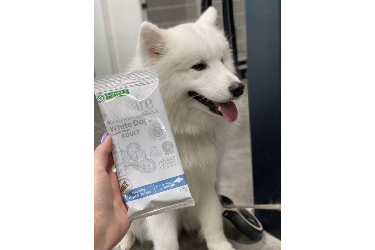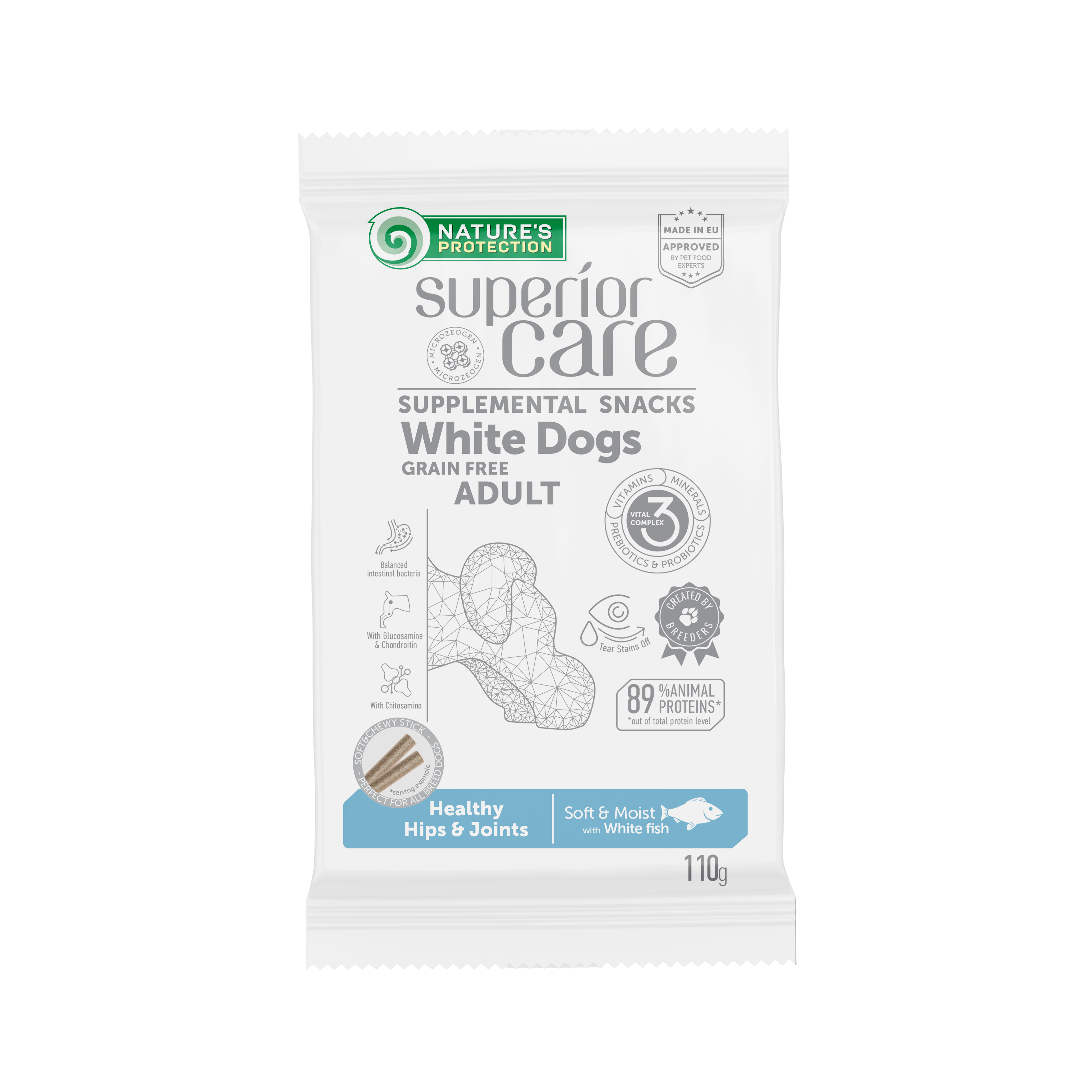 Nature's Protection Superior Care White Dogs Grain Free Healthy Hips & Joints supplemental snacks perfect for pet's overall well-being and hip joint support. The main source of protein in supplemental snacks is white fish meal. It is a good source of protein and provides essential amino acids, which are the building blocks of protein. It is also a rich source of omega-3 fatty acids, which are important for maintaining healthy skin and coat, promoting joint health, and supporting the immune system. White fish is also a low-fat protein source, making it a good option for pets that require a low-fat diet. These functional snacks – supplements have a wetter and softer texture than the usual treats. Wetter products reveal a more natural aroma, making them a favourite for even the pickiest pets. Supplemental snacks are enriched with clinoptilolite of volcanic origin from nature - MicroZeoGen. It helps to remove toxins from the pet's body and when it is detoxified the efficient nutrients, vitamins, and minerals easily absorb into the body. The composition contains glucosamine and chondroitin that may help to keep a pet's joints healthy and flexible. It is an ideal tool to ensure the efficiency and effectiveness of the pet's movement system. The supplemental snacks do not contain ingredients of grain origin, corn or soy products that can cause allergic reactions.