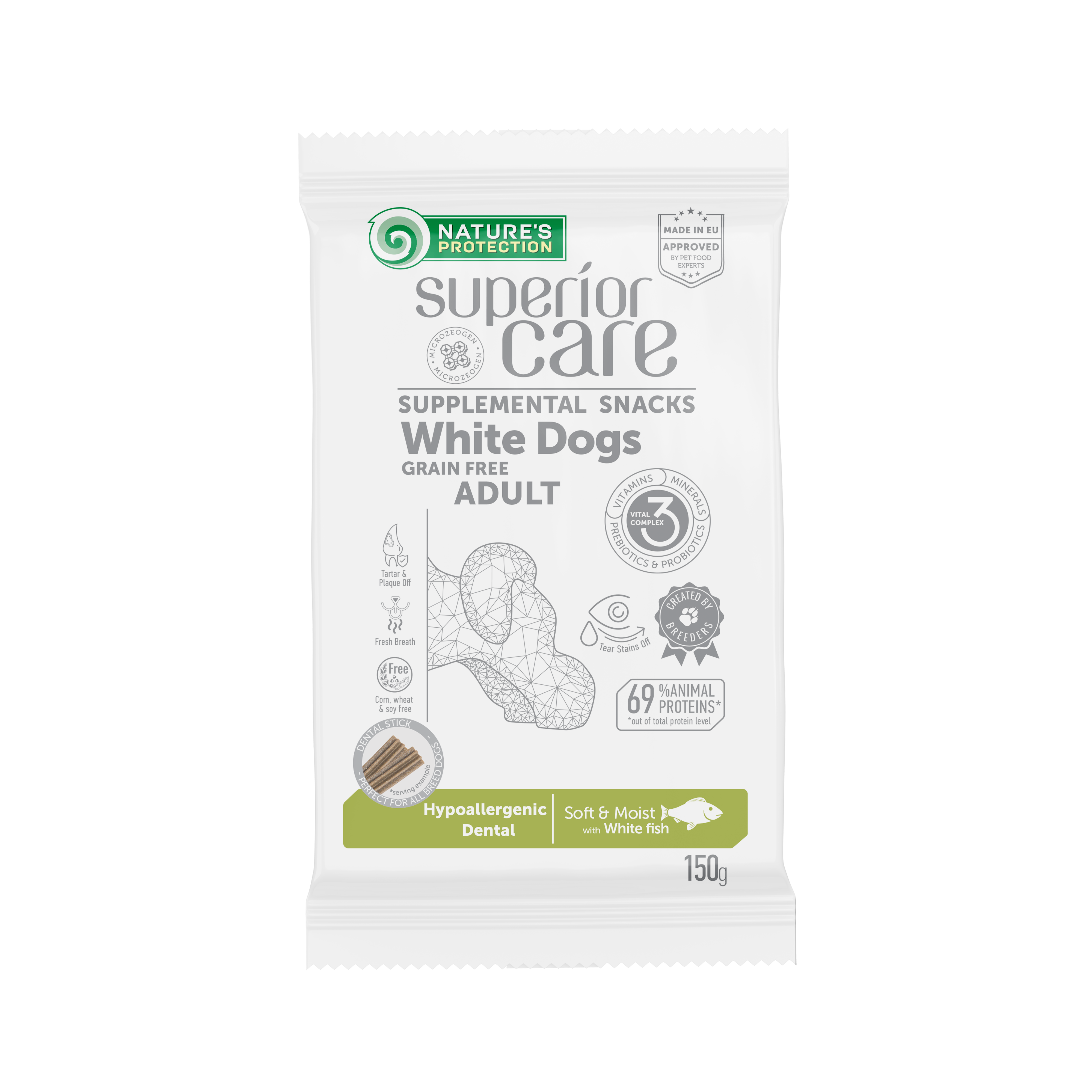 Nature's Protection Superior Care White Dogs Grain Free Hypoallergenic Dental supplemental snacks perfect for pet's overall well-being and dental health support. The main source of protein in supplemental snacks is white fish. It is a good source of protein and provides essential amino acids, which are the building blocks of protein. It is also a rich source of Omega-3 fatty acids, which are important for maintaining healthy skin and coat, promoting joint health, and supporting the immune system. White fish is also a low-fat protein source, making it a good option for pets that require a low-fat diet. These functional snacks – supplements have a wetter and softer texture than the usual treats. Wetter products reveal a more natural aroma, making them a favourite for even the pickiest pets. Supplemental snacks are enriched with clinoptilolite of volcanic origin from nature - MicroZeoGen. It helps to remove toxins from the pet's body and when it is detoxified the efficient nutrients, vitamins, and minerals easily absorb into the body. The composition contains seaweedwhich may help to take care of your pet's fresh mouth odour and prevent the growth of bacteria that causes the pet's mouth bad breath. The supplemental snacks do not contain ingredients of grain origin, corn or soy products that can cause allergic reactions.