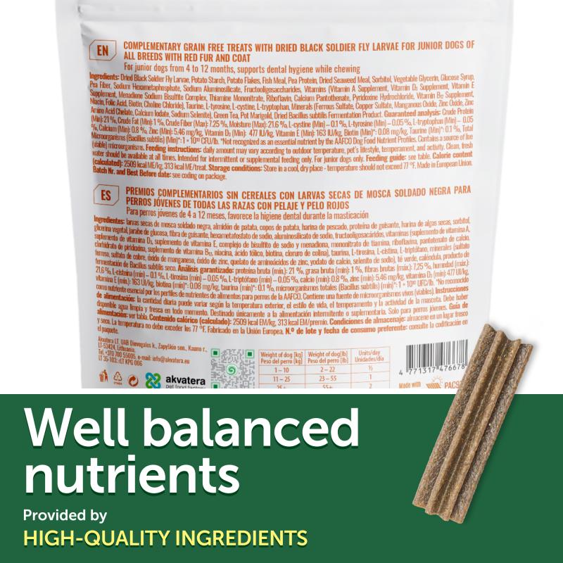 Nature's Protection Superior Care Red Coat Grain Free Gums & Oral Care supplemental snacks perfect for pet's overall well-being and oral care. The main protein source in these supplemental snacks is insects, a highly sustainable protein that requires less land, water, and feed than traditional livestock. Rich in high-quality protein, essential amino acids, vitamins, and minerals, insect protein is also hypoallergenic, making it an excellent choice for dogs with food sensitivities or allergies. These functional snacks – supplements have a wetter and softer texture than the usual treats. Wetter products reveal a more natural aroma, making them a favourite for even the pickiest pets. Supplemental snacks are enriched with clinoptilolite of volcanic origin from nature - MicroZeoGen, which helps to remove toxins and improve nutrient absorption. The unique production technology and mineral-sodium polyphosphate contained in the treats have antibacterial properties that can help reduce the number of bacteria, thus reducing the unpleasant smell in the dog’s mouth. The supplemental snacks do not contain ingredients of grain origin, corn or soy products that can cause allergic reactions.