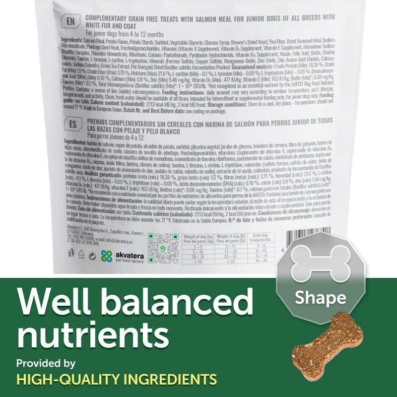Composition: salmon min. 24 % (dried and finely ground), potato flakes, pregelatinised potato starch, sorbitol, glycerine, glucose syrup, brewer's yeast, pea fibre, seaweed Ascophyllum nodosum (2 %), dynamic micronized clinoptilolite (1 %), chitosamine (from aquatic animals) (1 %), plantago seed (1 %), fructooligosaccharides (FOS) (0,9 %), green tea extract (0,5 %), marigold dried (0,02 %). Additives/1 kg: nutritional additives: vitamin D₃ (3a671)* - 577 IU, vitamin E (3a700) - 204 mg, biotin (3a880) - 0,08 mg, L-tyrosine (3c401) - 500 mg, L-cystine (3c391) - 1 g, L-tryptophan (3c440) - 500 mg. Technological additives: antioxidants, preservatives. Zootechnical additives: gut flora stabilisers: Bacillus velezensis DSM 15544 (4b1820) - 1×1010 CFU. *Simultaneous use with Vitamin D2 is not allowed.