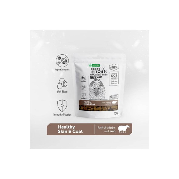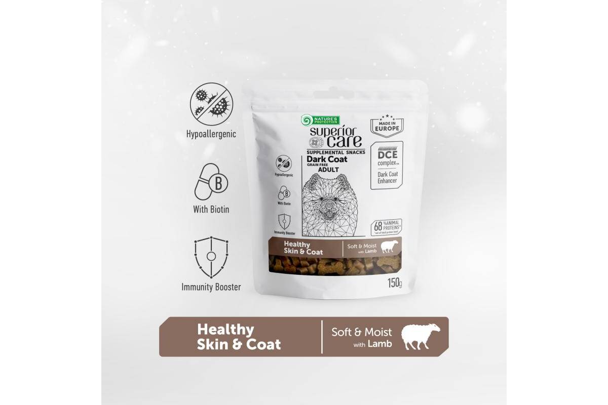 NATURE'S PROTECTION SUPERIOR CARE complementary grain free feed – snacks to support healthy skin and coat with lamb for adult dark coat dogs 150 g