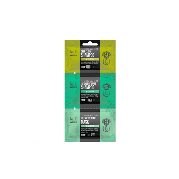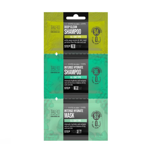 TAURO PRO LINE dog and cat white and light coat and skin shampoo and mask sample set 1 x 6 ml, 1 x 8 ml, 1 x 4 ml