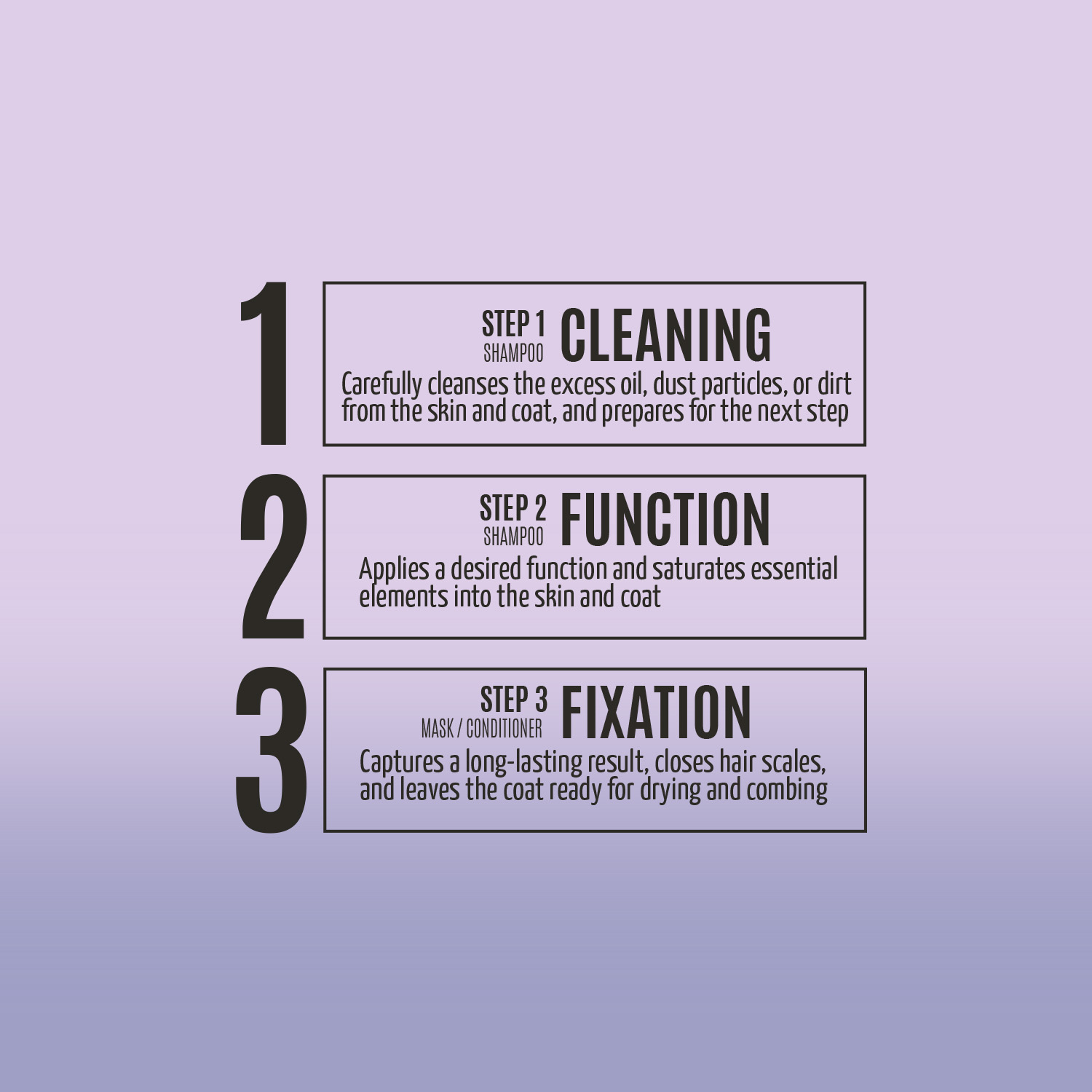 - Step 3 - Fixation. The coat is conditioned, the result is fixed and the moisture of the coat is maintained