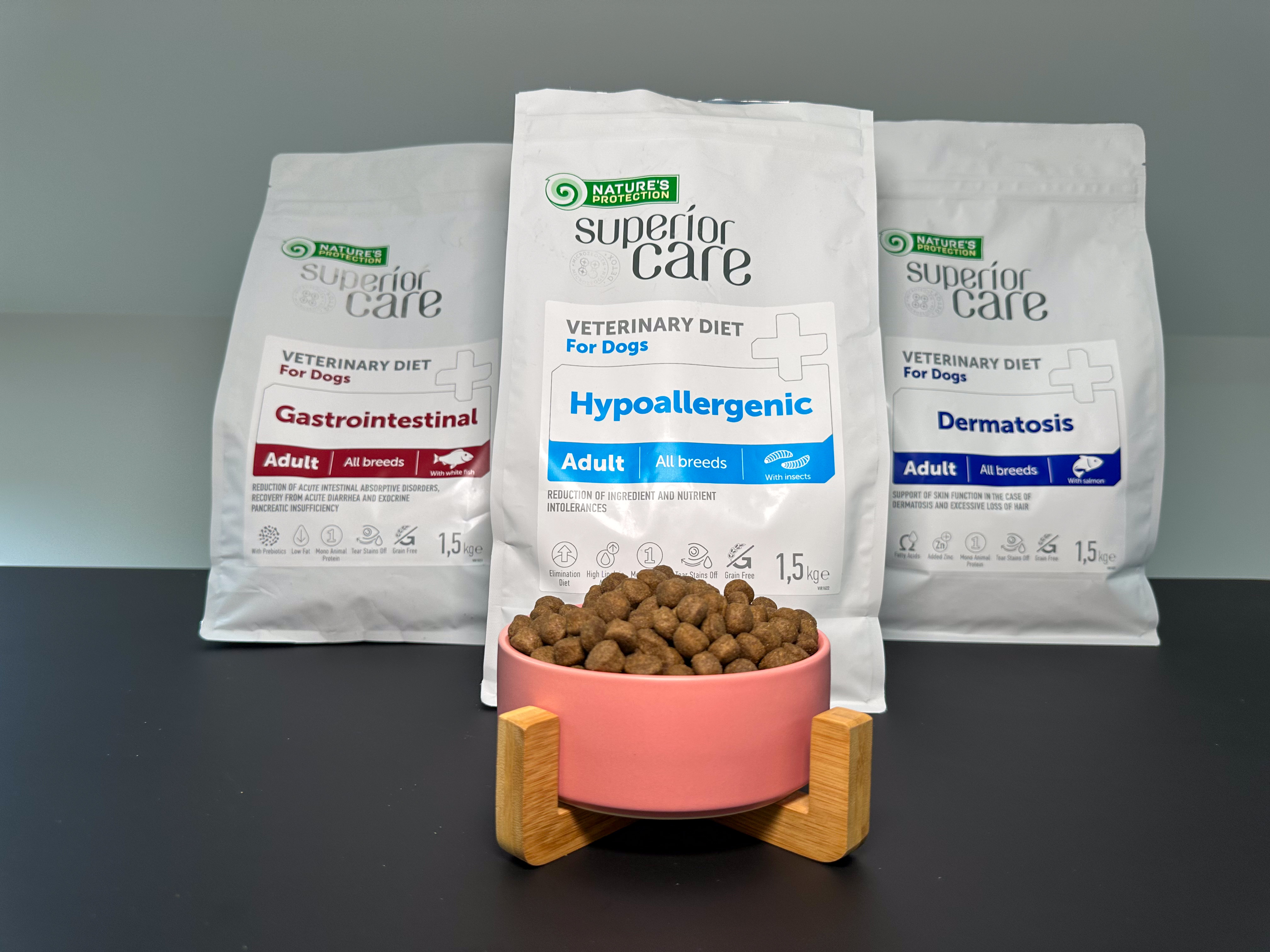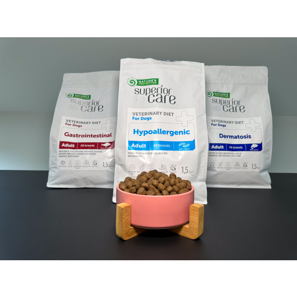 Nature's Protection Superior Care Veterinary Diet Gastrointestinal dog food ingredients were exceptionally balanced for to help control intestinal or digestion issues. It contains a single source of animal protein, which helps avoid other animal protein allergens in the diet that might cause symptoms. The specially selected diet recipe does not contain grains or gluten, reducing the risks of allergy to cereal proteins and gluten intolerance.