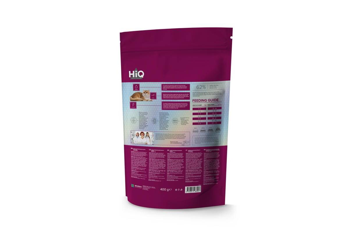 HiQ Sterilised Care is a Super Premium (premium) quality dry feed for adults, 1 year old and older cats after sterilization and cats after castration. The composition of this dry feed is enriched with unique ingredients that will help maintain a healthy body and energy balance. The ingredient will not only provide your cat's body with all the necessary materials, but will also ensure better absorption of materials and easierdigestion.