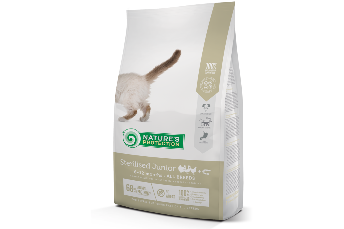 Nature's Protection Sterilised Junior for kittens are created with ingredients that are perfect for providing the necessary amount of calories, vitamins and minerals for kittens development. The main protein source of this dry cat food is poultry. It is a high quality protein that is an excellent source of nutrition for cats, as it is packed with essential nutrients that can help promote good health. It also contains an Antarctic krill, a unique and 100% sustainable source ofOmega-3 and choline, which improves cardiovascular health, reduces inflammation, and supports brain activity. This dry kittens food's complete and balanced composition is enriched with natural supplements like MicroZeoGen that help remove toxins from the body and support a healthy immune system. The composition is enriched with Omega-3 and Omega-6 fatty acids essential for healthy skin and coat conditions. As well as mono- and polyunsaturated fatty acidssupport the immune system, while saturated fatty acids provide required energy. All ingredients are carefully selected by veterinary and nutritional experts based on the true needs of your pet.