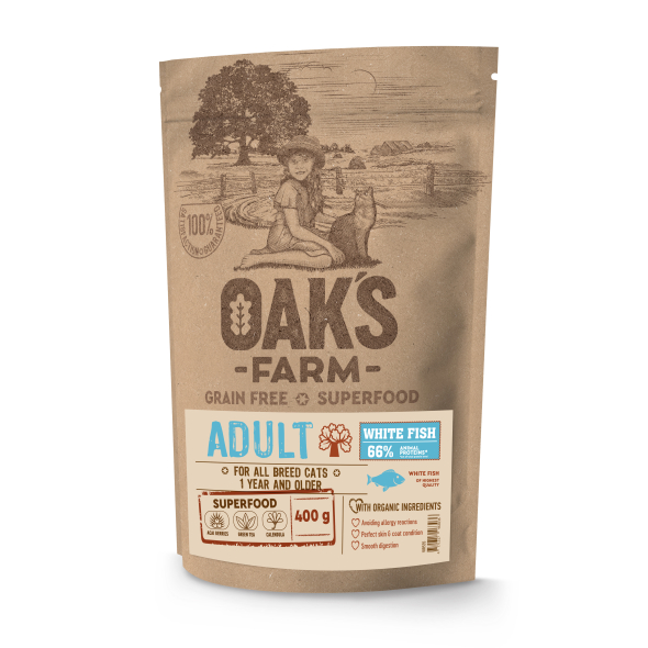 - OAK'S FARM dry grain free food for adult cats with white fish 400 g
