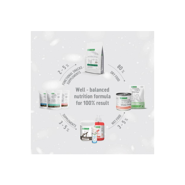 Nature‘s Protection Superior Care White Dogs Grain Free with White fish for Adult Small and mini Breeds is known for its well-balanced composition and raw materials which help to fight against brown tears stains and to keep healthy skin and coat. The main source of protein in this complete dry dog food is white fish. It is hypoallergenic, easily digestible, perfect for weight control and a great source of vitamins A and D. It also contains Antarctic krill, a unique and 100% sustainable source of Omega-3 and choline for healthy development. The complete and balanced composition of this dry dog food is enriched with clinoptilolite of volcanic origin from nature - MicroZeoGen. It helps to remove toxins from the pet's body and when it is detoxified the efficient nutrients, vitamins, and minerals easily absorb into the body. The composition is enriched with superior sources of Omega-3 fatty acids that could help to maintain the intensive colour of the coat and the perfect condition of the skin.