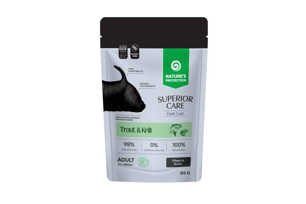NATURE'S PROTECTION SUPERIOR CARE grain free wet pet food with trout and krill for adult all breed dogs with dark coat 85 g