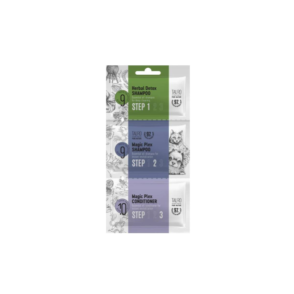 TAURO PRO LINE Pure Nature Herbal Detox + Magic-Plex sample set for dogs and cats, dog and cat shampoo and conditioner sample set 1 x 6 ml, 1 x 8 ml, 1 x 4 ml