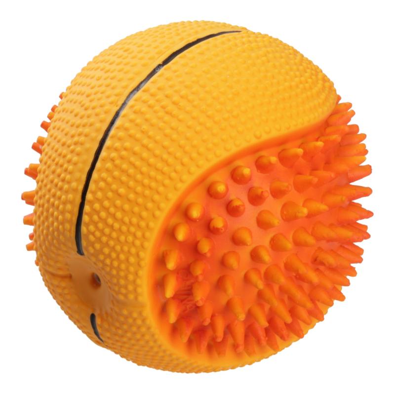 An orange latex toy shaped like a basketball, designed for active play. Elastic, safe, and gentle on the gums. 10 cm in size, suitable for both indoor and outdoor use.