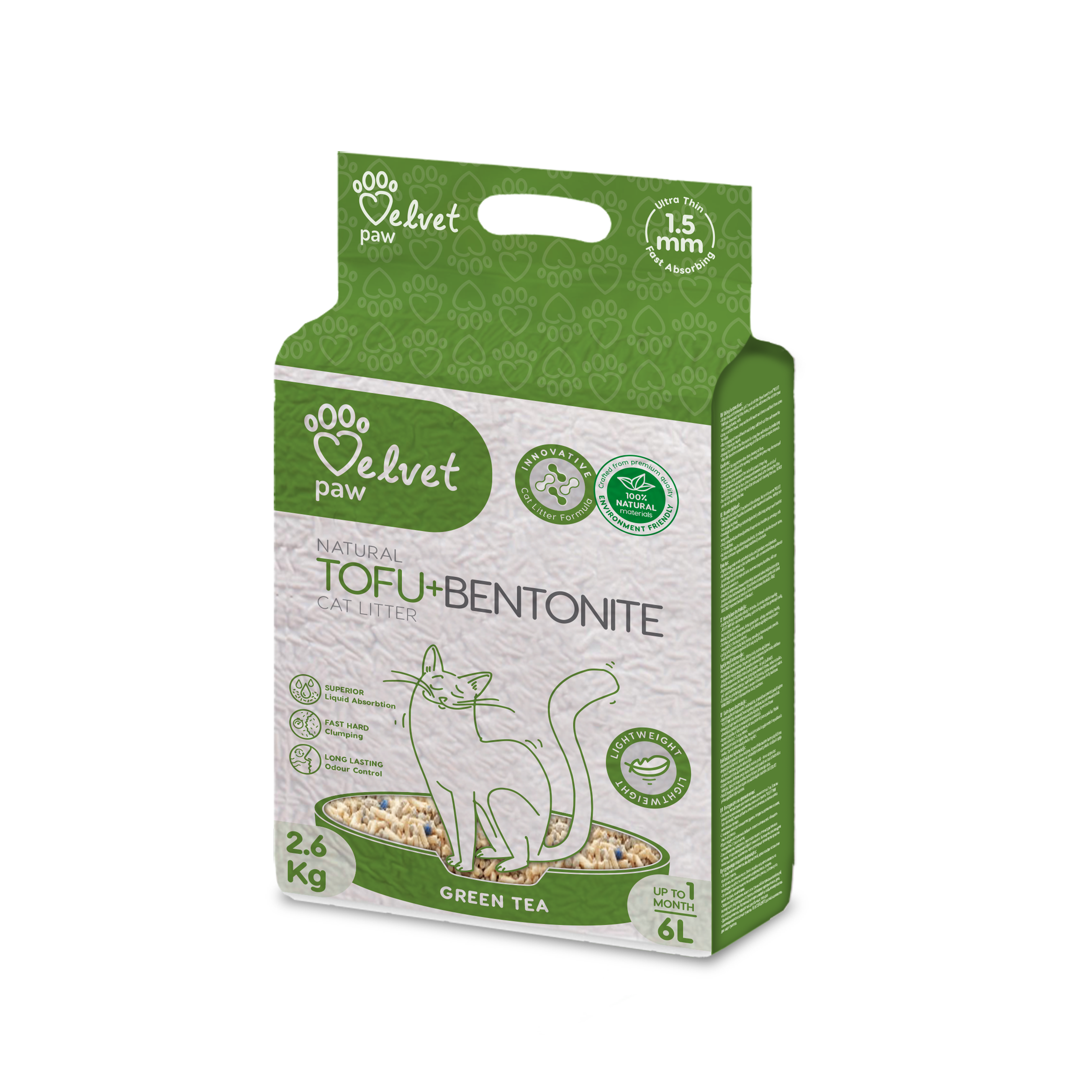 VELVET PAW TOFU cat litter mixed with bentonite and green tea extract 1.5 mm granule,2.6 kg / 6 l