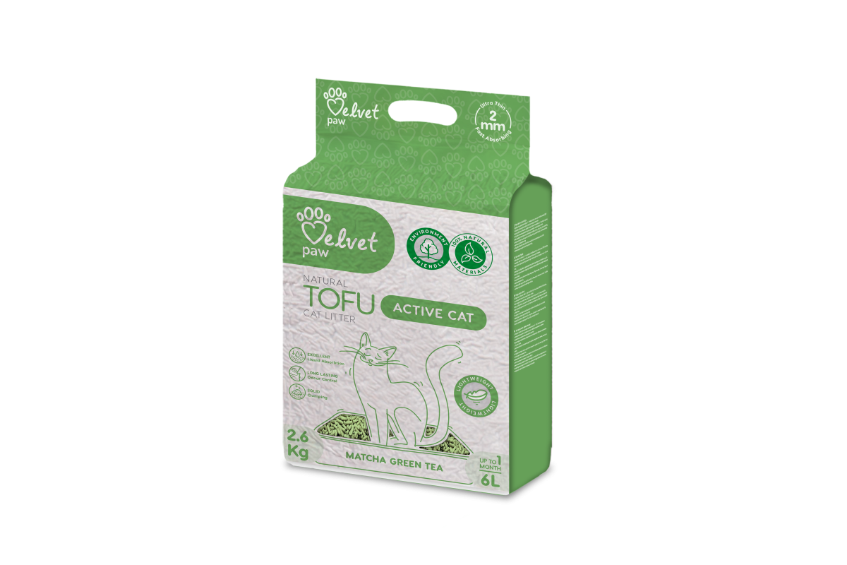 VELVET PAW TOFU active cat litter with green matcha tea essence is made from 100% natural pea fibre, without any synthetic additives or dyes. It rapidly absorbs moisture, neutralises unpleasant odors, and is exceptionally gentle on your cat's sensitive paws.