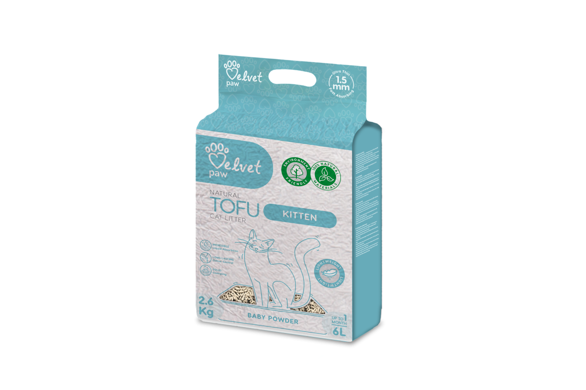 VELVET PAW TOFU kitten litter with baby powder essence is made from 100% natural pea cellulose, without any synthetic additives or dyes. It rapidly absorbs moisture, neutralises unpleasant odors, and is exceptionally gentle on your cat's sensitive paws.
