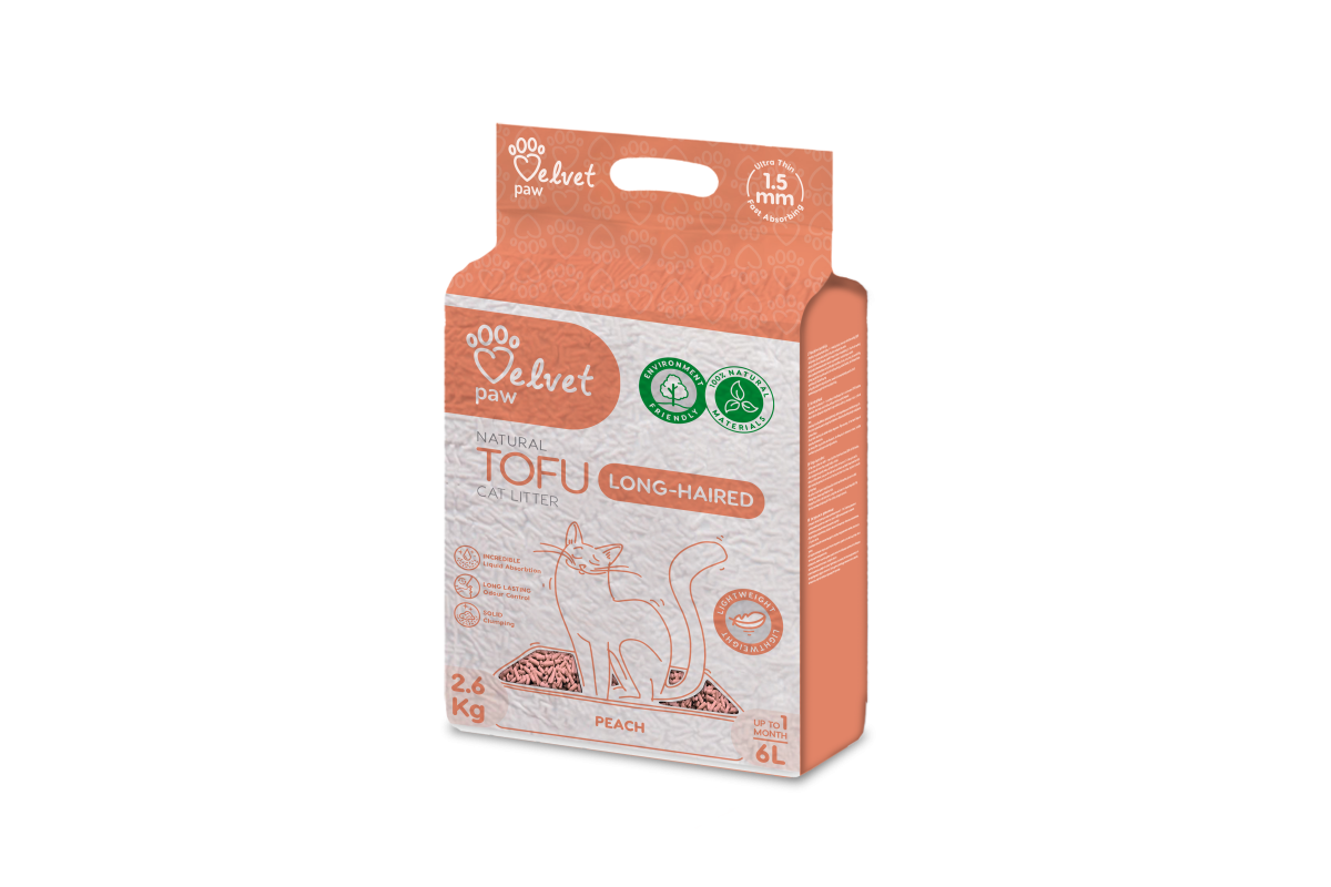 VELVET PAW TOFU longhair cat litter with peach essence is made from 100% natural pea cellulose, without any synthetic additives or dyes. It rapidly absorbs moisture, neutralises unpleasant odors, and is exceptionally gentle on your cat's sensitive paws.
