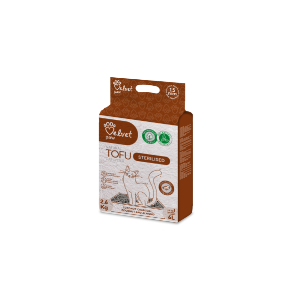 VELVET PAW TOFU sterilised cat litter with coconut charcoal, coconut, and almond essence is made from 100% natural pea cellulose, without any synthetic additives or dyes. It rapidly absorbs moisture, neutralises unpleasant odors, and is exceptionally gentle on your cat's sensitive paws.