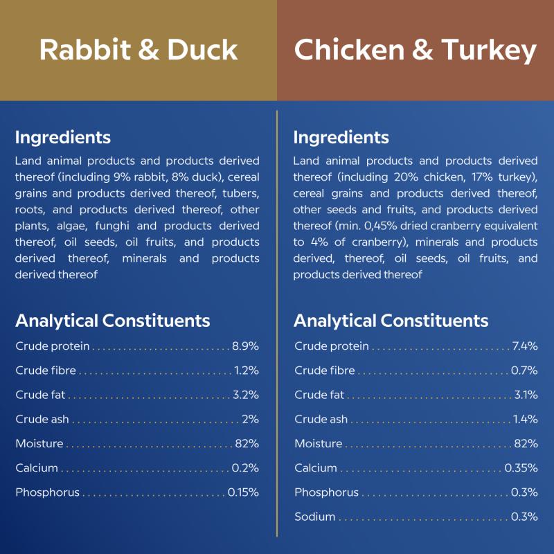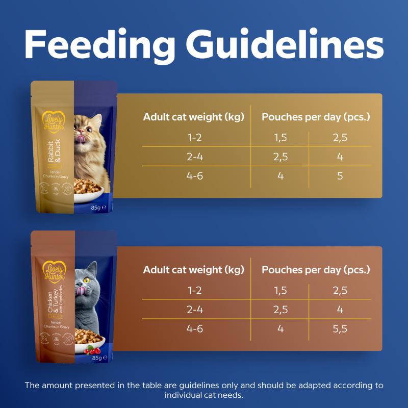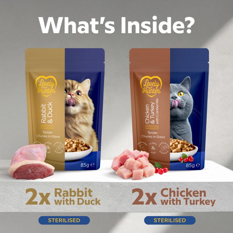 LOVELY HUNTER wet pet food set for sterilised adult cats of all breeds with rabbits and duck, with chicken and turkey 4x85 g