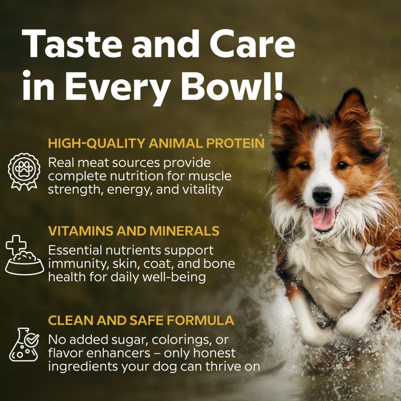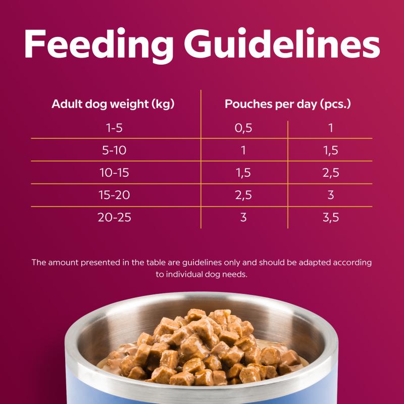 PIECES IN A JUICY SAUCE. The combination of beef and lamb provides a natural taste and animal-based proteins, which are necessary for muscle maintenance, endurance, and energy. The gravy makes it even more palatable and helps maintain proper fluid levels in the body, which is especially important for dogs that drink less water.