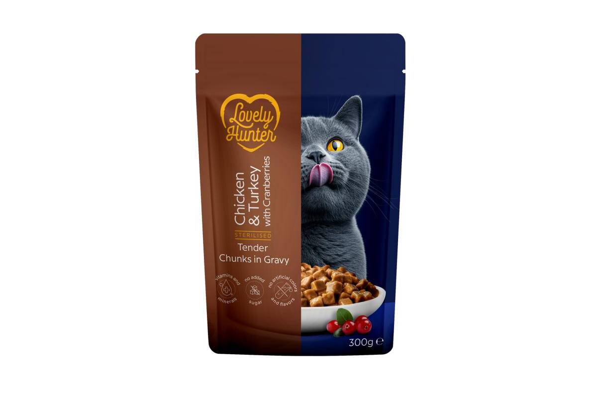 LOVELY HUNTER wet pet food with chicken, turkey and cranberries for sterilised adult cats of all breeds 300 g